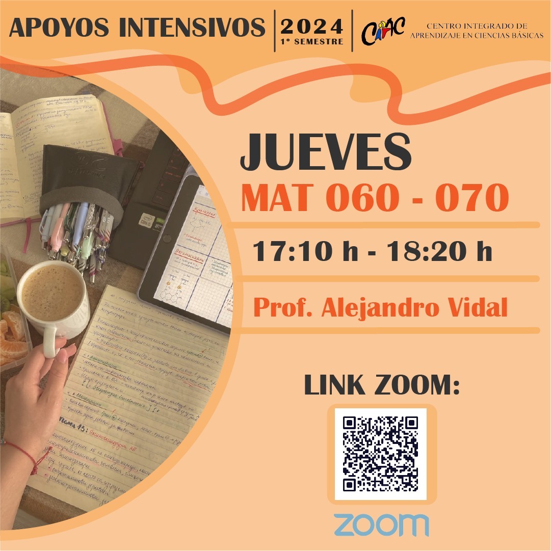 Apoyo Intensivo en modalidad Online de MAT060-070. Para participar, sólo tienes que escanear código QR adjunto e introducir datos de tu correo y clave INSTITUCIONAL. Todo el material de estudio (guías, pautas y cápsula audiovisual) lo podrás encontrar ingresando a nuestro sitio de CIAC VIRTUAL via Aula USM, cliquear en la pestaña "INTENSIVOS CIAC" ; Seleccionar la pestaña "MATEMÁTICA I" en donde encontrarás la asignatura de MAT060-070 y todo el material de estudio de este semestre y anteriores. Para quienes aún no tengan acceso al sitio CIAC VIRTUAL.